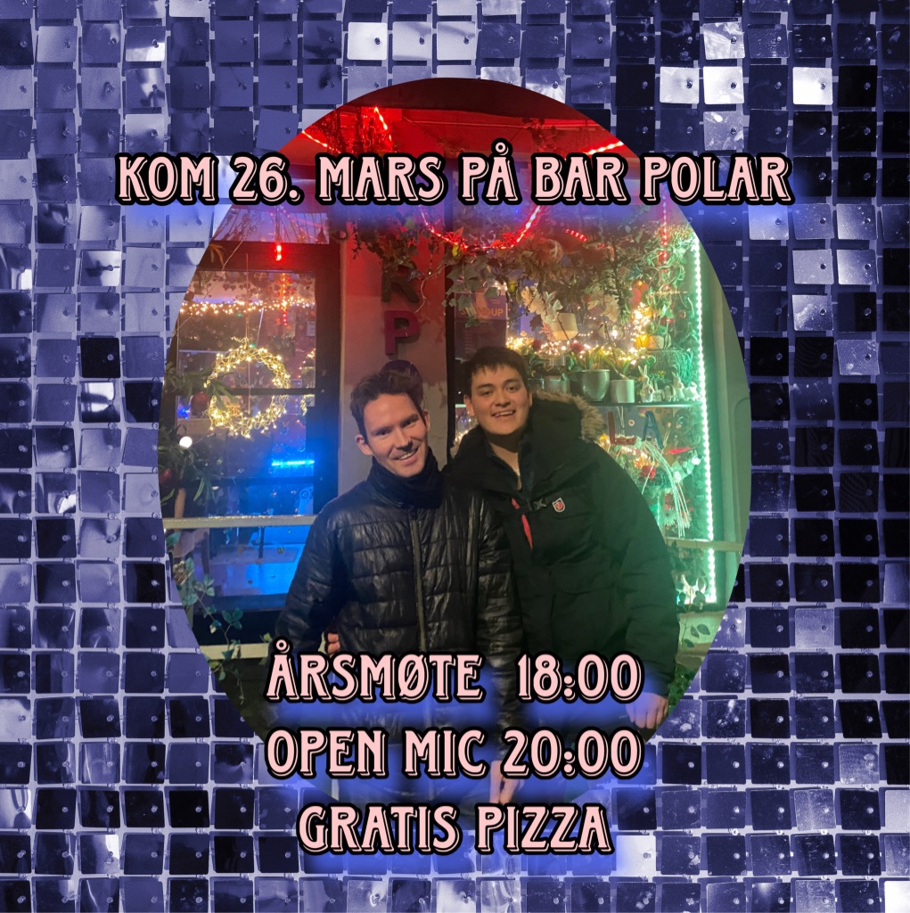 Torsdag 26. Mars er det vår premiere på Open Mic´s som vi skal arrangere på bar polar hver uke. Før vår aller første open mic vil det være årsmøte, der vi skal velge årets styre, og planlegge hva vi skal arrangere fremover. Veldig viktig at alle medlemmer som ønsker å være med å velge hva vi skal arrangere og hvordan kommer på møtet. Deet blir Gratis pizza til alle som kommer på årsmøtet. Etter årsmøtet feirer vi med Premiere på vår nye open mic på Bar Polar! Alle som har låter de vil dele er velkomne opp på scenen! Ta gjerne med egne instrumenter, men vi stiller med gitar & Piano for de som vil låne.